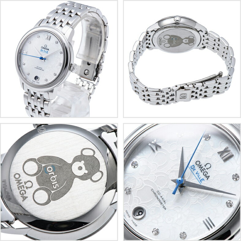 商品情報 モデル デ・ヴィル プレステージ コーアクシャル オービス Ref 424.10.33.20.55.004 状態 新品 サイズ レディース ケース直径32.7mm素材SSカラーホワイトダイヤルシェル(テディベア)インデックス8Pダイヤベゼルベルトブレスムーブメント自動巻き機能デイト表示 ダイヤ、ストーン付き 限定モデル備考2016年新作 コーアクシャルムーブメント搭載 失明防止を目的とする非営利組織“オービスインターナショナル”の活動支援モデル ダイヤルと裏蓋にはテディベアが刻印されております。